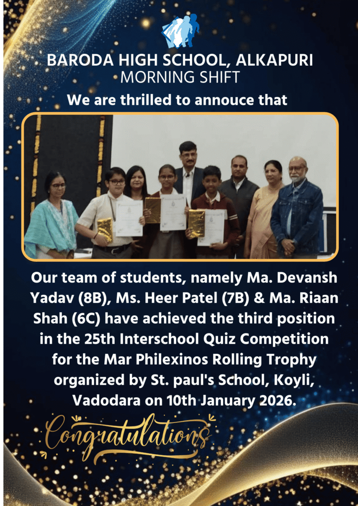 Our students Devansh Yadav (8B), Heer Patel (7B) and Riaan Shah (6C) achieved third position in the 25th Inter School Quiz Competition for the Mar Philexinos Rolling Trophy organized by St. Paul’s School, Koyli, Vadodara on 10th January, 2026